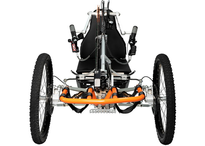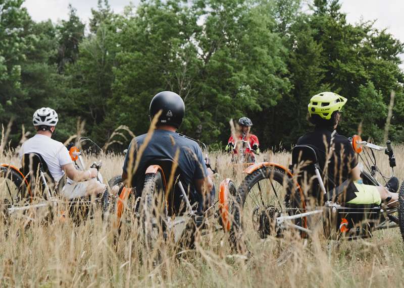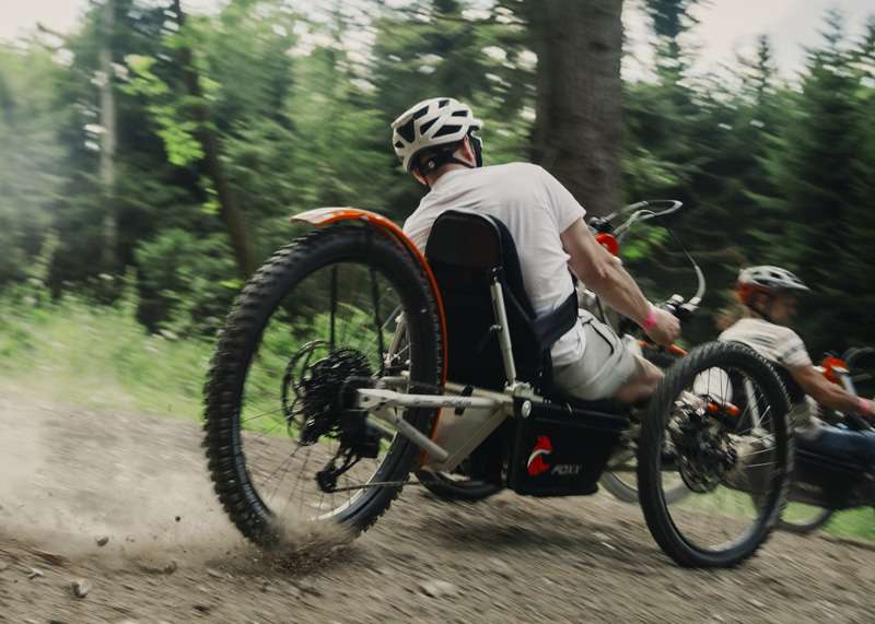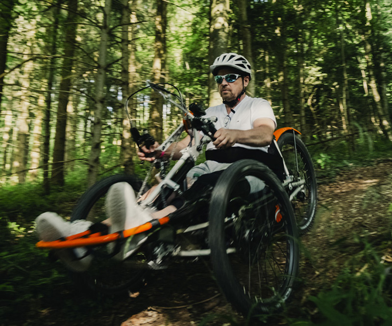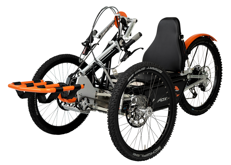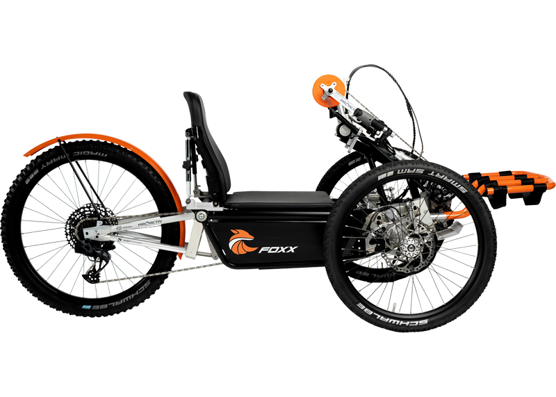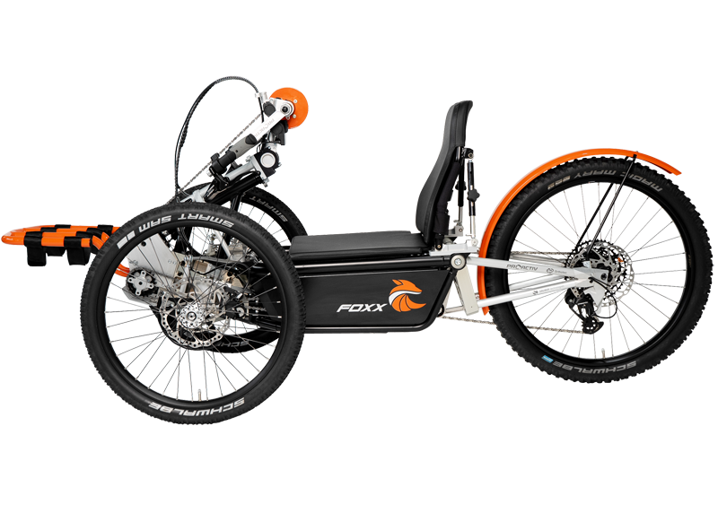 Il sofisticato sistema dorsale con angolo regolabile e il cuscino della sella appositamente sviluppato offrono un sostegno e una stabilità ottimali sulla bicicletta. Il supporto gambe regolabile individualmente - sia nella zona delle cosce che in quella dei piedi - e il supporto del movimento centrale regolabile ad angolo garantiscono una posizione di seduta ergonomica e il massimo comfort di guida. Come opzione, è possibile dotare il FOXX di cinghie per la parte superiore del corpo e per le cosce, che assicurano la stabilità della bici e offrono un collegamento diretto con la bicicletta. Questo vi permette di avere il controllo su qualsiasi superficie.