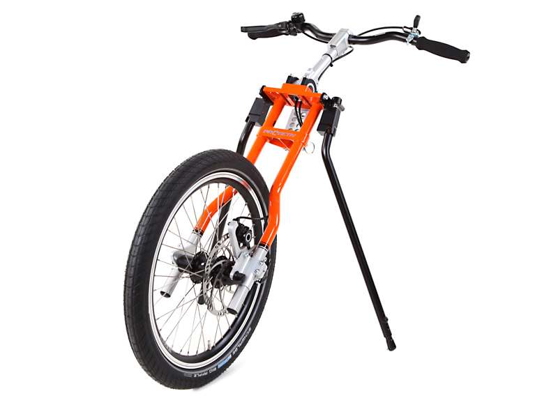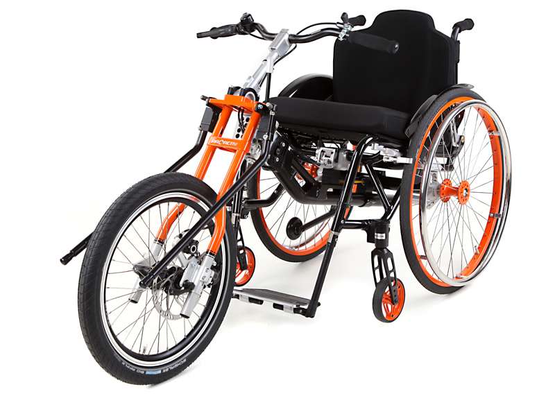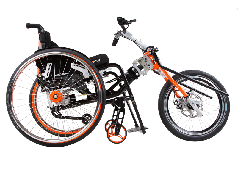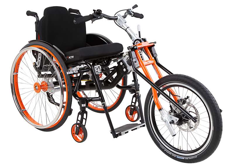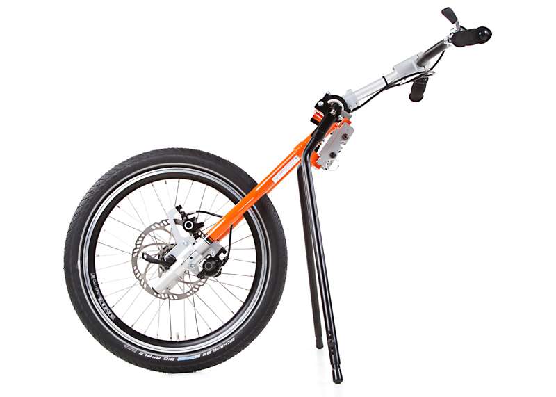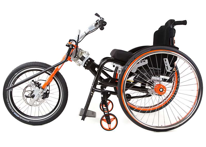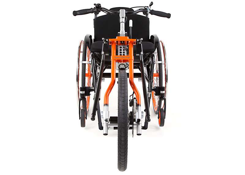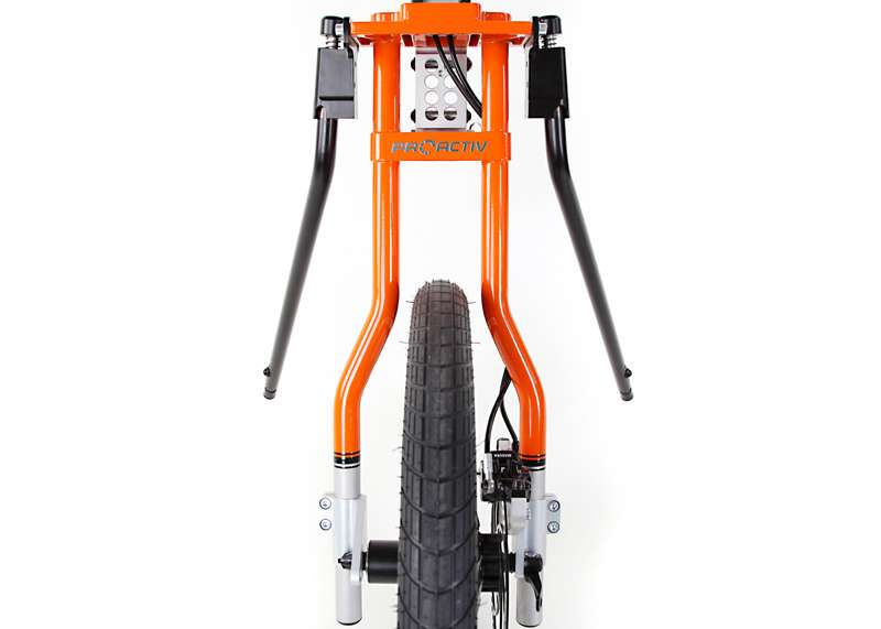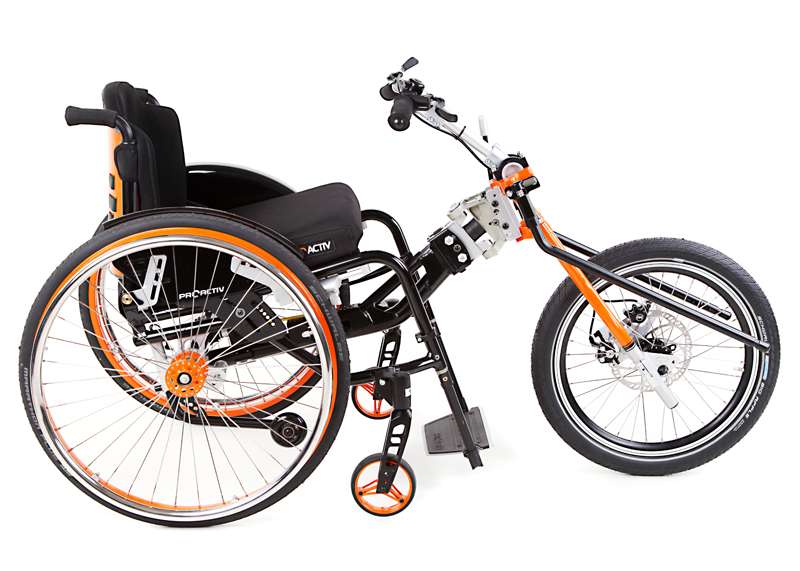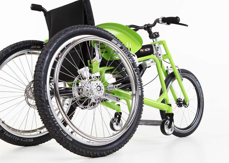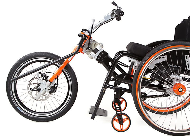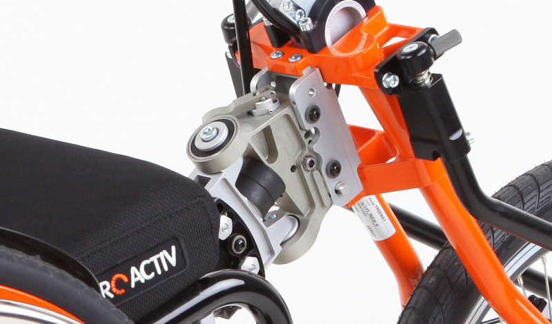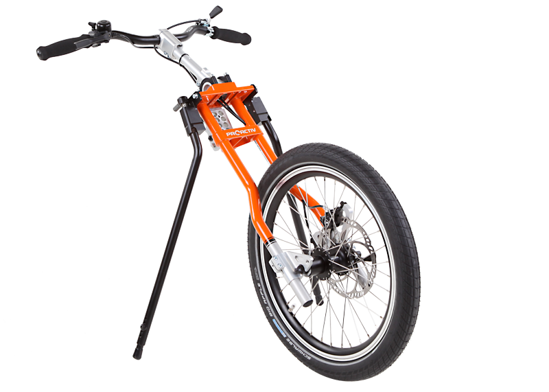 L'adattamento viene eseguito tramite un adattatore centrale (fissaggio sotto alla superficie di seduta sul tubo dell'asse e trasversale o sul meccanismo di piegatura) o adattatore frontale (fissaggio ai tubi del telaio anteriori). Sono sufficienti poche manovre per adattare gli adattatori sulla carrozzina o rimuoverli. Quando si disaccoppiano, rimane poco peso in più sulla carrozzina che non subisce alcuna limitazione nel suo funzionamento (ad es. meccanismo di piegatura). L'adattatore può essere utilizzato trasversalmente per tutte le biciclette adattive, dispositivi di trazione e attrezzi aggiuntivi PRO ACTIV con la stessa dimensione della ruota: UN solo adattatore per MOLTE combinazioni.
