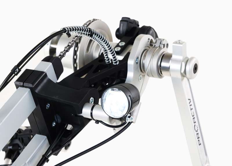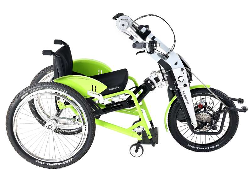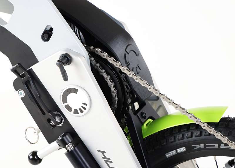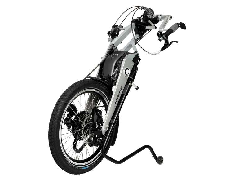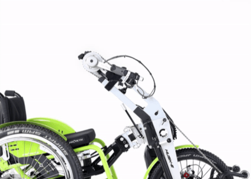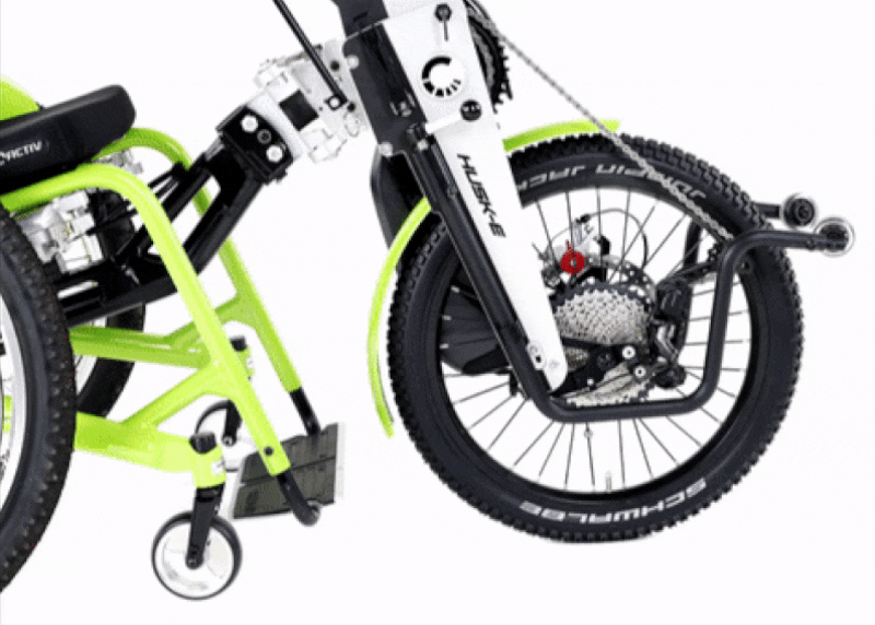 La HUSK-E rivoluziona il trasporto delle handbike: il supporto del movimento centrale ripiegabile consente di ridurre rapidamente e facilmente le dimensioni della bicicletta adattiva, rendendola ideale per il trasporto.