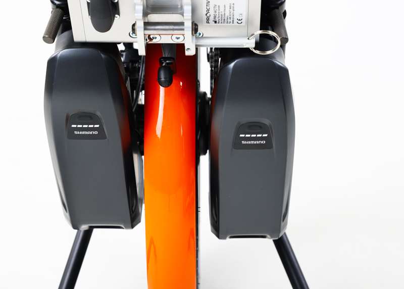 Con un'autonomia fino a 85 km e l'opzione di un doppio supporto per la batteria per raddoppiare l'autonomia, anche i lunghi viaggi non sono un problema. Grazie al dispositivo di commutazione, è facile passare da una batteria all'altra utilizzando i tappi magnetici. Questo è possibile anche senza la funzione full finger.