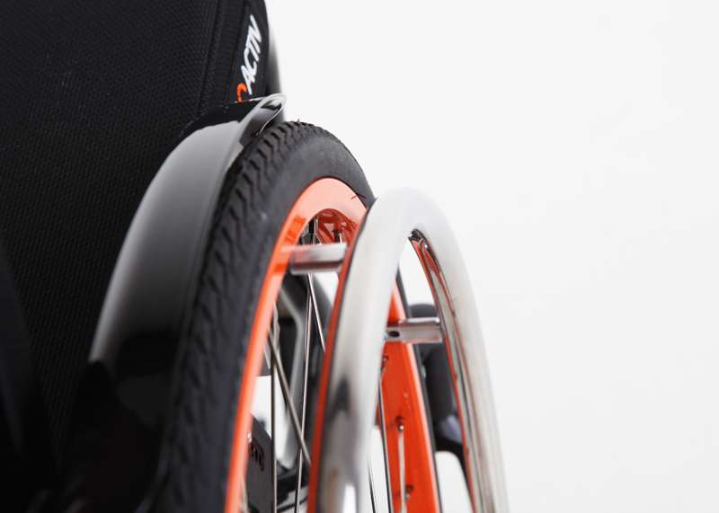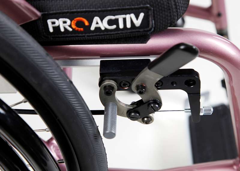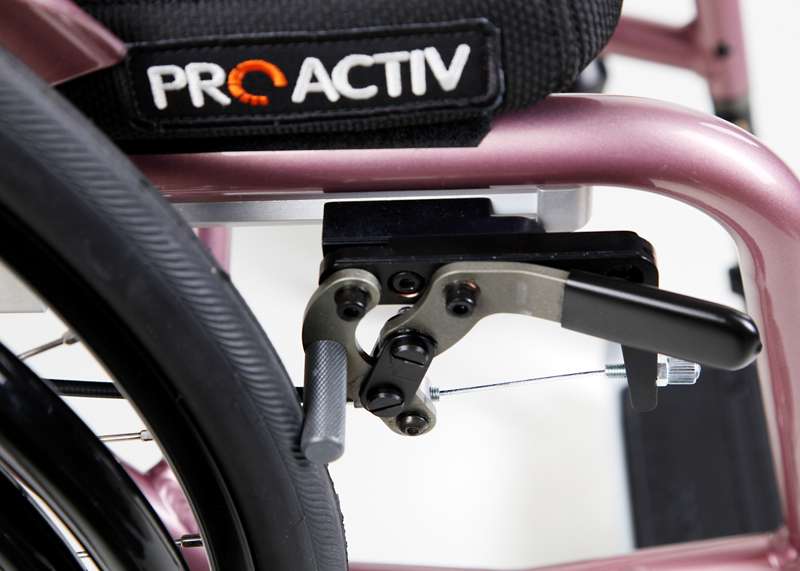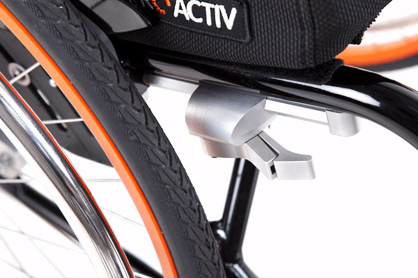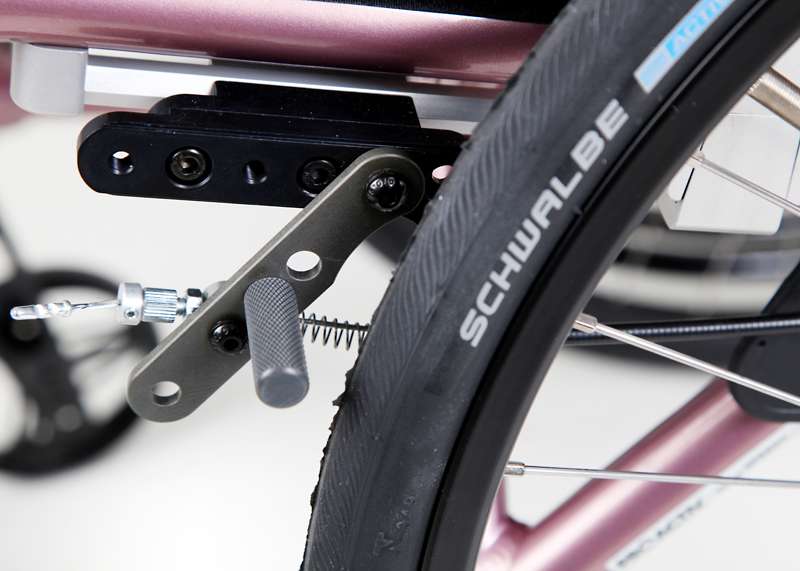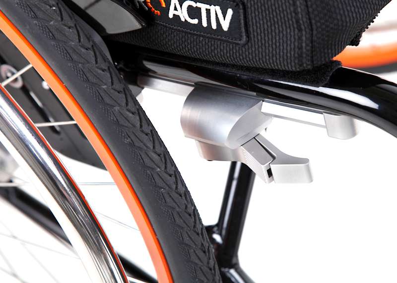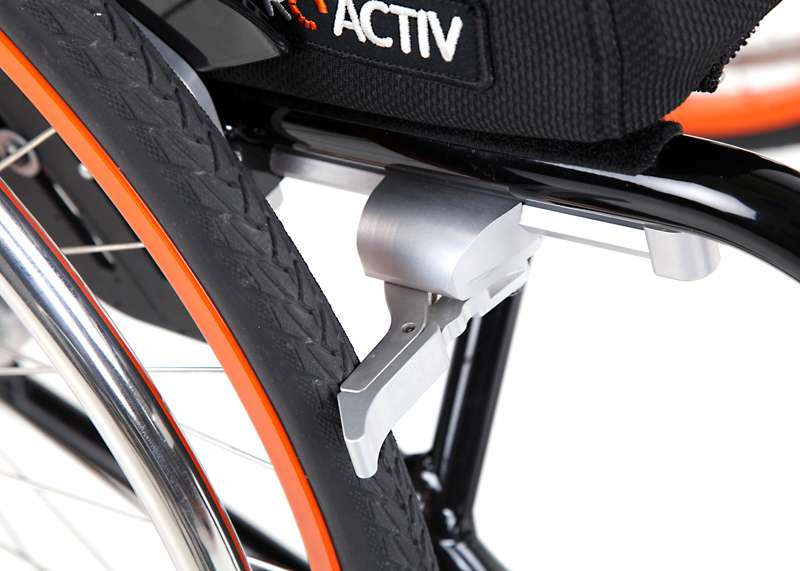 Comodo da usare è il nuovo elegante freno di stazionamento integrale. Con il freno aperto, questo rimane ribaltato completamente sotto il telaio, lasciando un ampio spazio di movimento alle mani e alle dita. Questo freno è applicato in modo quasi invisibile sotto al telaio per sottolineare il design raffinato della carrozzina.