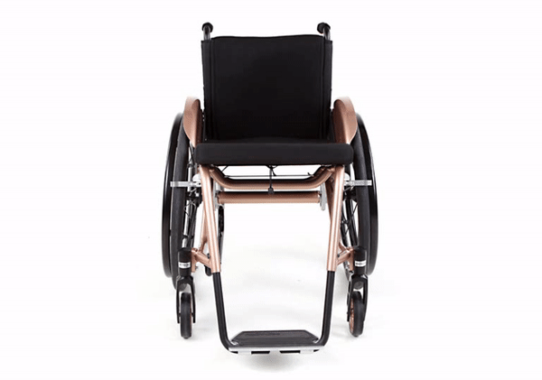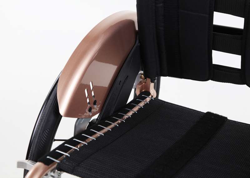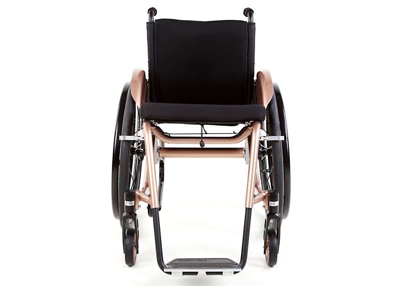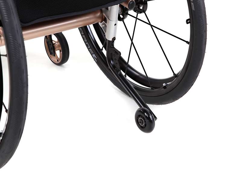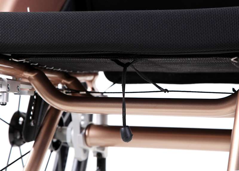 Comodo da usare è il nuovo elegante freno di stazionamento integrale. Con il freno aperto, questo rimane ribaltato completamente sotto il telaio, lasciando un ampio spazio di movimento alle mani e alle dita. Questo freno è applicato in modo quasi invisibile sotto al telaio per sottolineare il design raffinato della carrozzina.