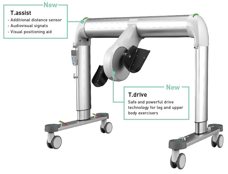 Dotato di un set di 4 ruote piroettanti doppie con sistema di frenata per bloccare il dispositivo una volta posizionato ed evitare che scivoli o si sposti. Brevi tempi per le regolazioni e le impostazioni: è possibile iniziare l’allenamento in pochi minuti grazie alla regolazione elettrica dell'altezza tramite il comando di controllo con display, a T.Drive e al rilevamento della distanza tramite appositi sensori.
