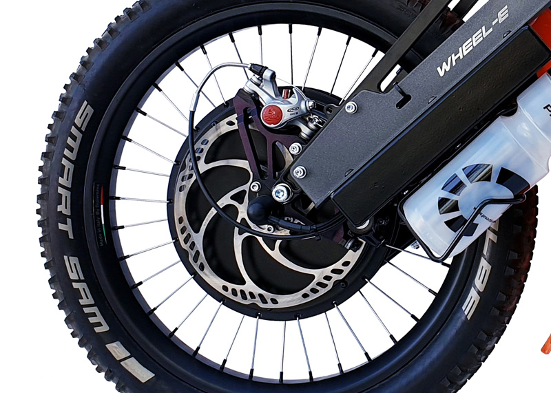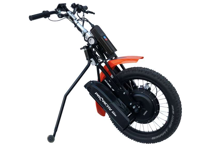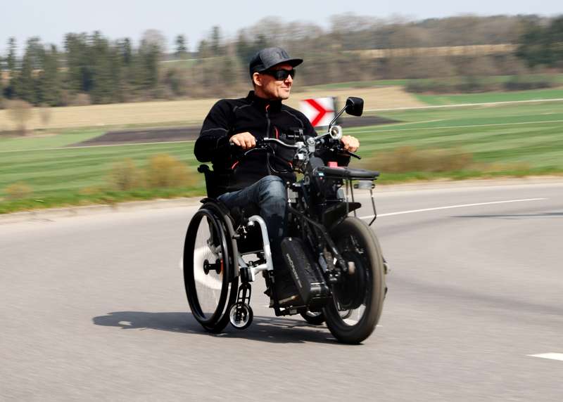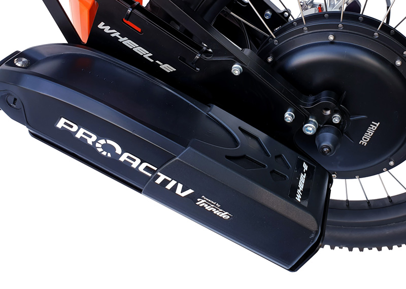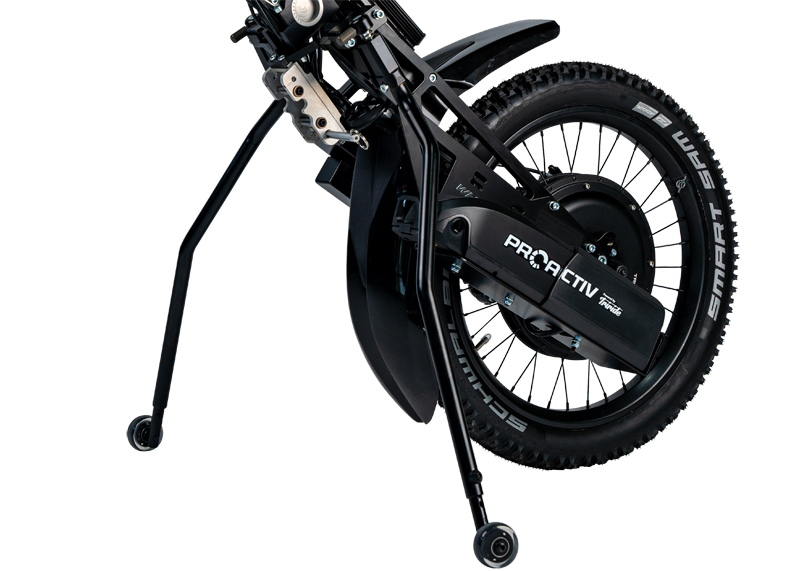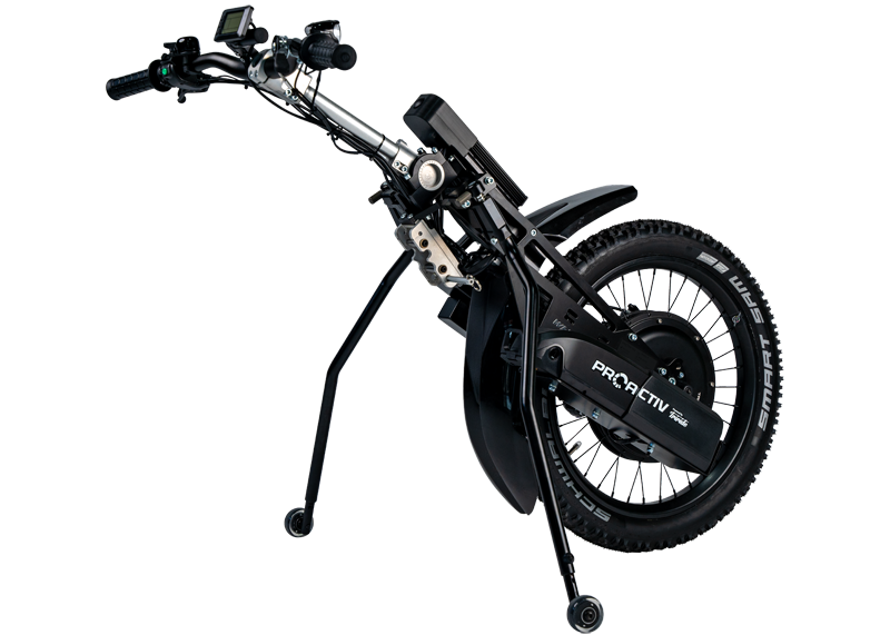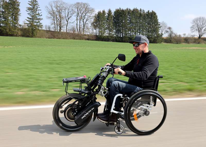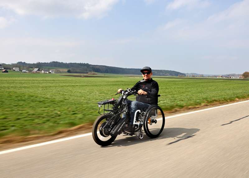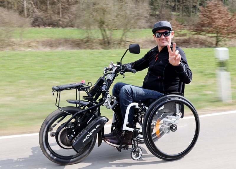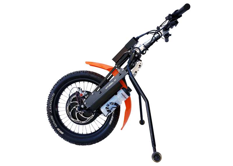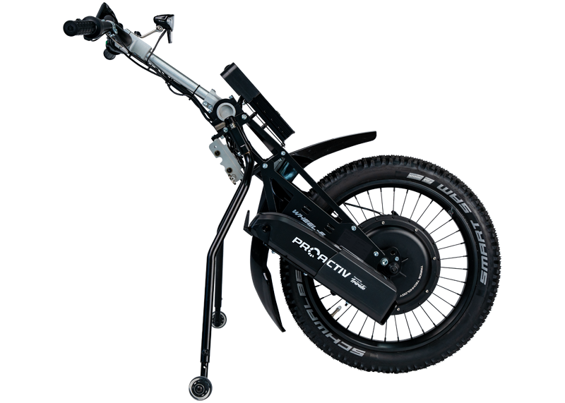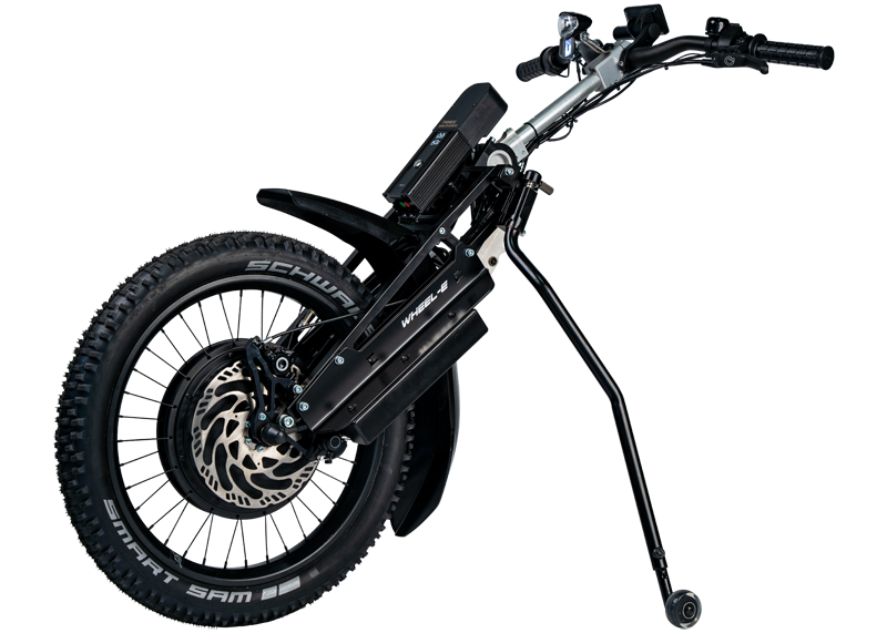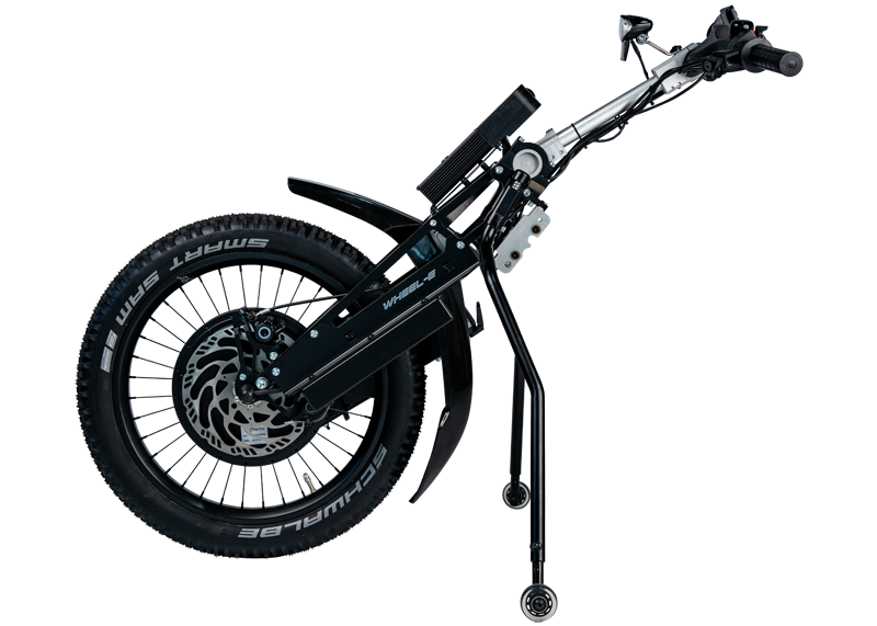 Il dispositivo WHEEL-E può essere utilizzato anche su terreni accidentati con la dotazione di una ruota da 20" con pneumatici larghi. Grazie ad accessori versatili quali parafanghi, portapacchi e specchietto retrovisore così come accessori per utilizzatori con abilità limitate, è possibile adattare il dispositivo WHEEL-E in modo ottimale all'utilizzatore.