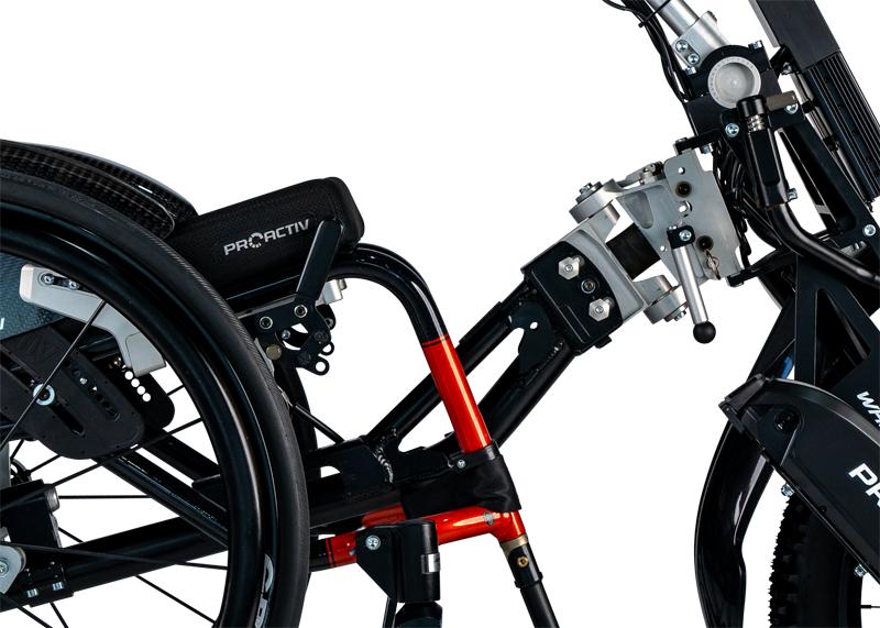 L'adattamento viene eseguito tramite un adattatore centrale (fissaggio sotto alla superficie di seduta sul tubo dell'asse e trasversale o sul meccanismo di piegatura) o adattatore frontale (fissaggio ai tubi del telaio anteriori). Sono sufficienti poche manovre per adattare gli adattatori sulla carrozzina o rimuoverli. Quando si disaccoppiano, rimane poco peso in più sulla carrozzina che non subisce alcuna limitazione nel suo funzionamento (ad es. meccanismo di piegatura). L'adattatore può essere utilizzato trasversalmente per tutte le biciclette adattive, dispositivi di trazione e attrezzi aggiuntivi PRO ACTIV con la stessa dimensione della ruota: UN solo adattatore per MOLTE combinazioni.